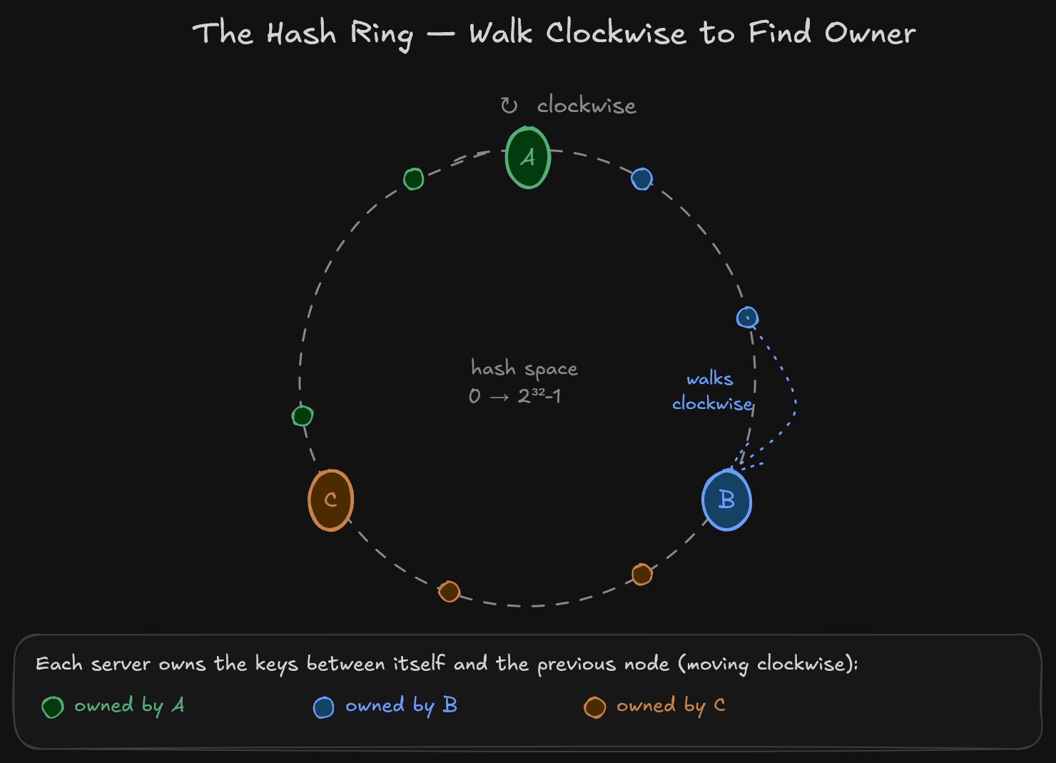 The hash ring. Servers and keys live on the same circular hash space. Each key walks clockwise to find its owner, so every key belongs to exactly one server.