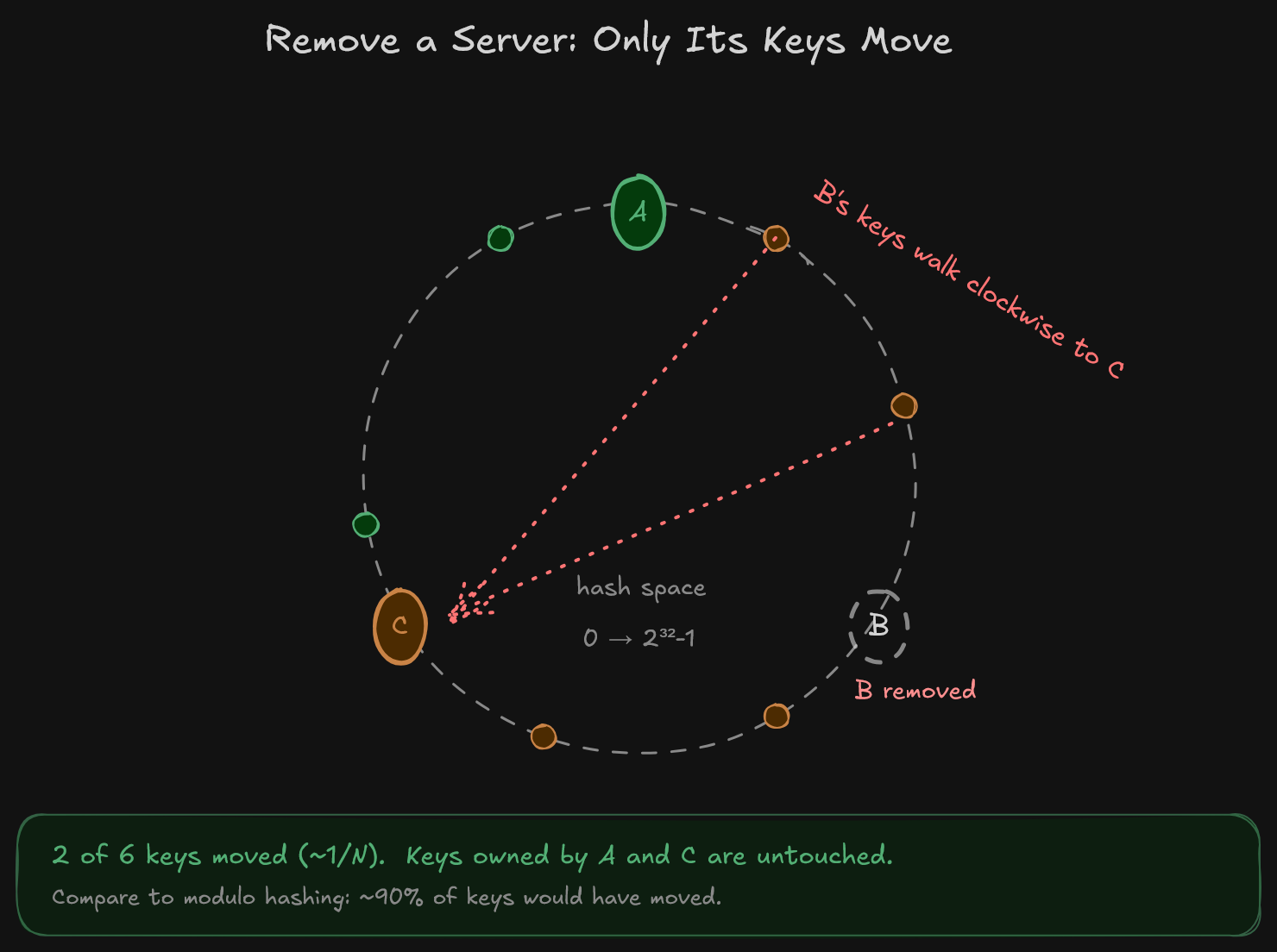 Instead of ~90% of keys moving, only the keys owned by the affected server are touched. On average that works out to about 1/N of the keyspace, so removing one node from a 10-node cluster moves roughly 10% of keys instead of 90%. This is a massive improvement for cache cluster stability during scaling events.