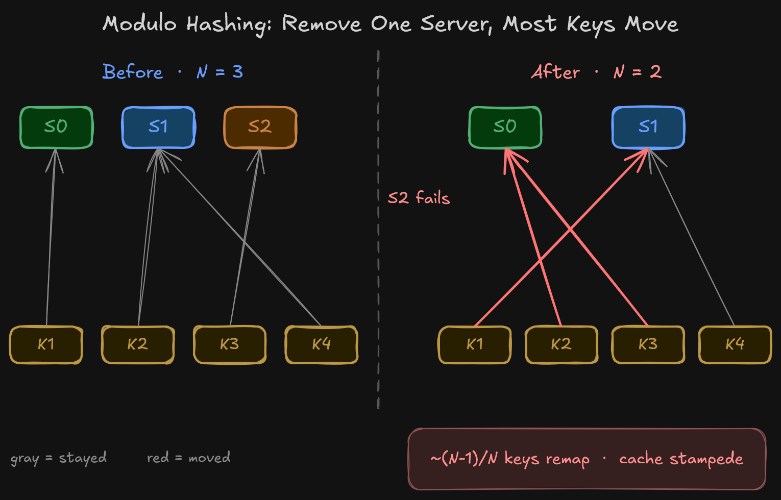 Let’s say Server 2 goes down. Now N = 2. The same key, hash("user:1234") % 2, evaluates to 0. That key has moved to Server 0. One key moving isn’t a big deal, but the issue is that almost every key moves. When N changes, the modulo result changes for the majority of keys. In a cache cluster, this means almost every cached entry becomes invalid simultaneously. Every request becomes a cache miss, and the backing database gets hit with traffic it wasn’t designed to absorb all at once.