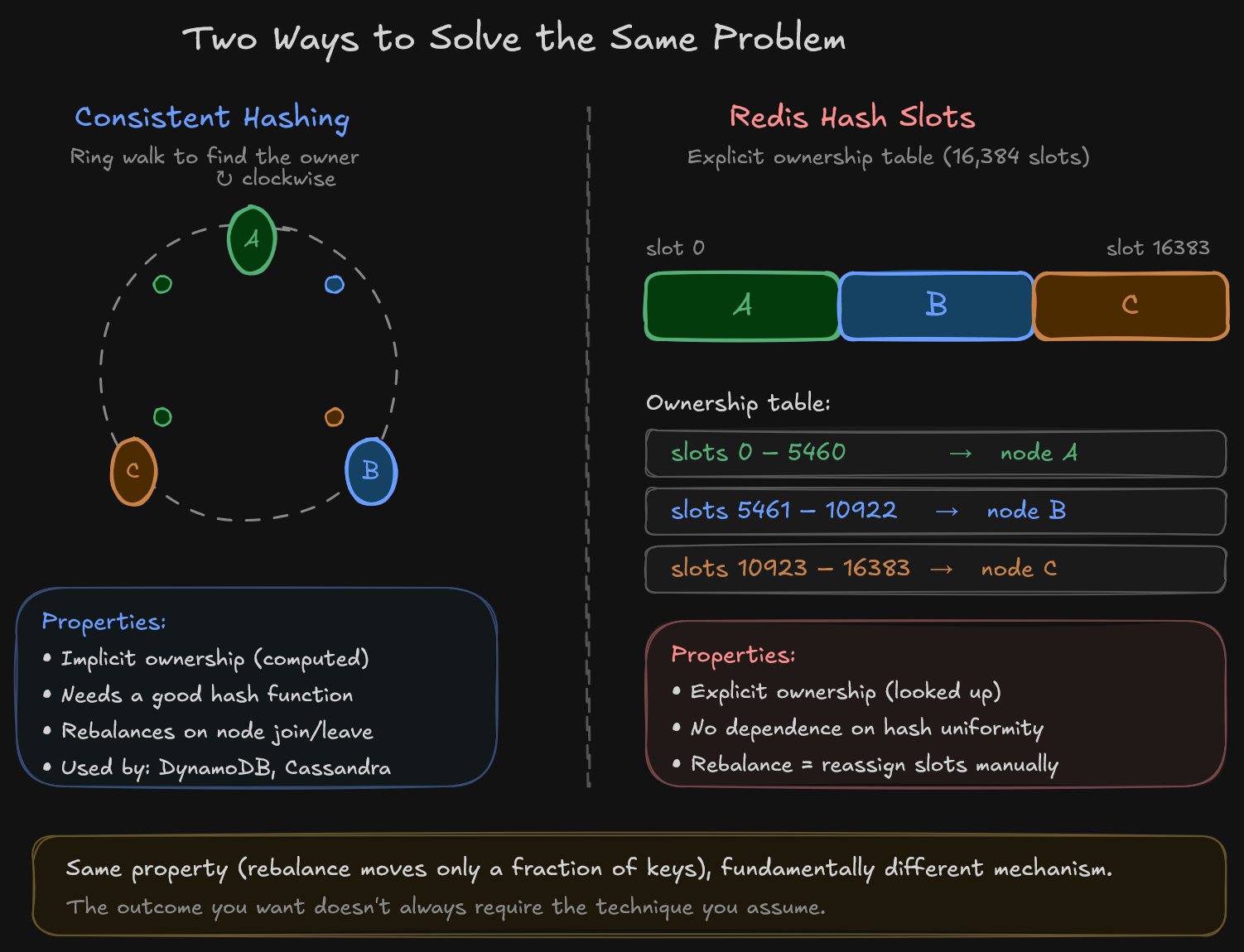 Two ways to assign keys to nodes. The hash ring computes ownership implicitly by walking the ring. Redis Cluster stores ownership explicitly in a lookup table. Same rebalancing property (only a fraction of keys move), fundamentally different mechanism.