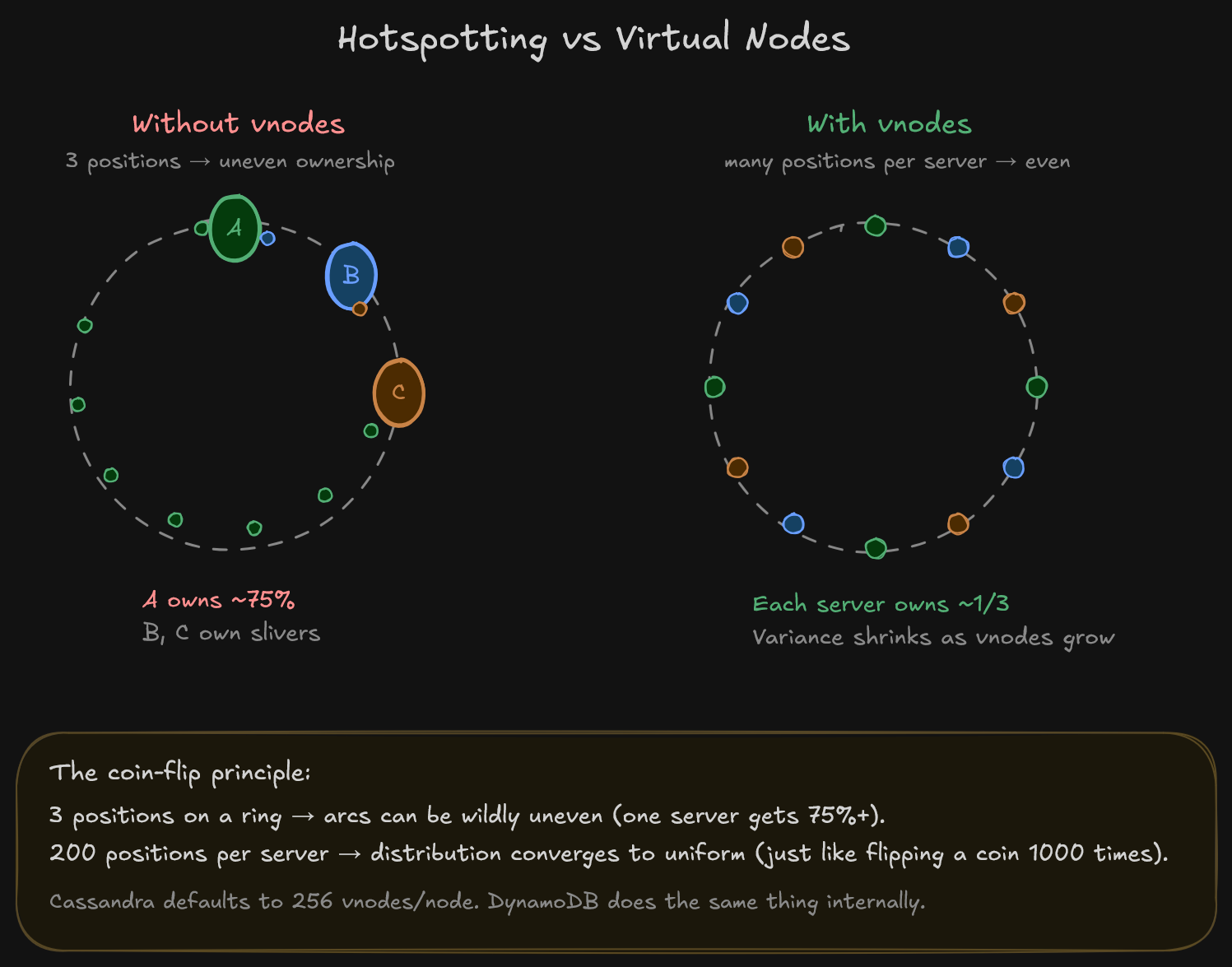 Virtual nodes also tighten the rebalancing math from earlier. The “only ~1/N keys move” claim holds reliably only when each physical node is represented by many vnodes. With just a few positions on the ring, removing a single server could shift a much larger fraction depending on where that server happened to land. Vnodes turn that probabilistic “on average” property into something concrete, something you can actually count on in production. This is the real reason Cassandra defaults to 256 vnodes per node, not just for distribution but for predictable rebalancing.