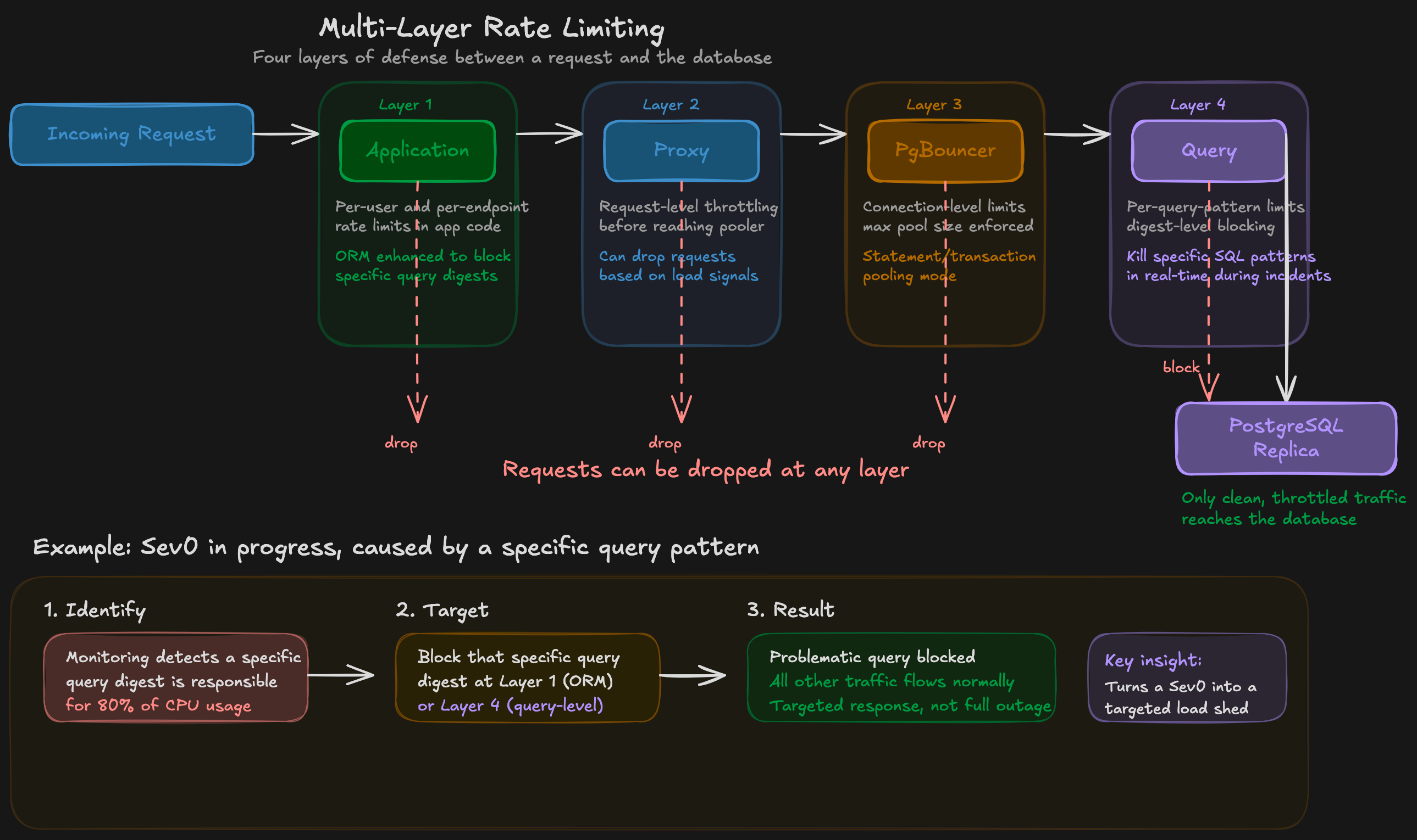 Rate limiting at the application layer alone isn’t sufficient. OpenAI implements rate limiting at four layers: application, connection pooler, proxy, and query. They even enhanced their ORM (Object-Relational Mapping) layer to support blocking specific query digests for targeted load shedding.