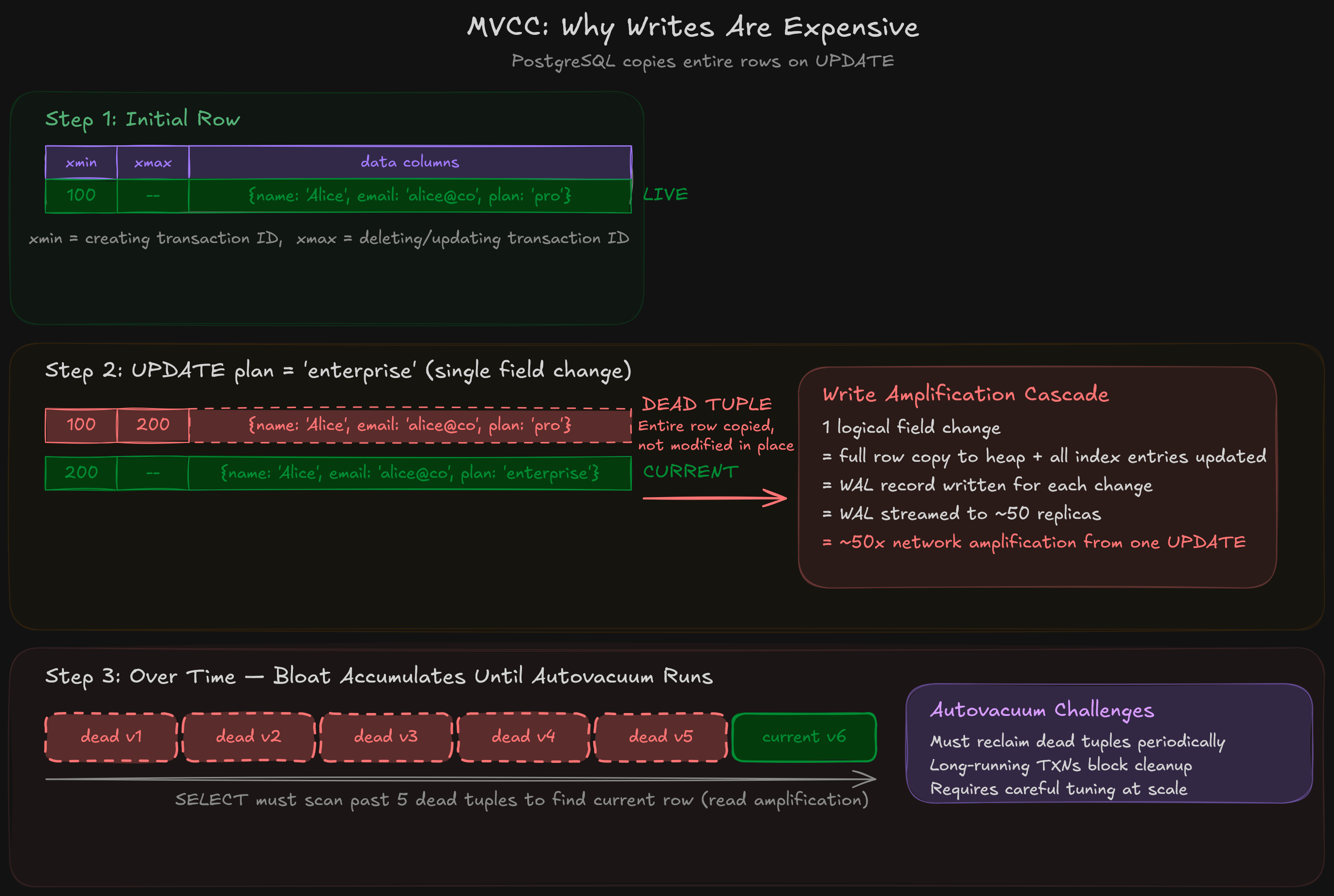So what exactly is the problem? When PostgreSQL updates a row, even a single field, it doesn’t modify the row in place. Instead, it copies the entire row to create a new version. The old version becomes a “dead tuple” that sticks around until the autovacuum process cleans it up.