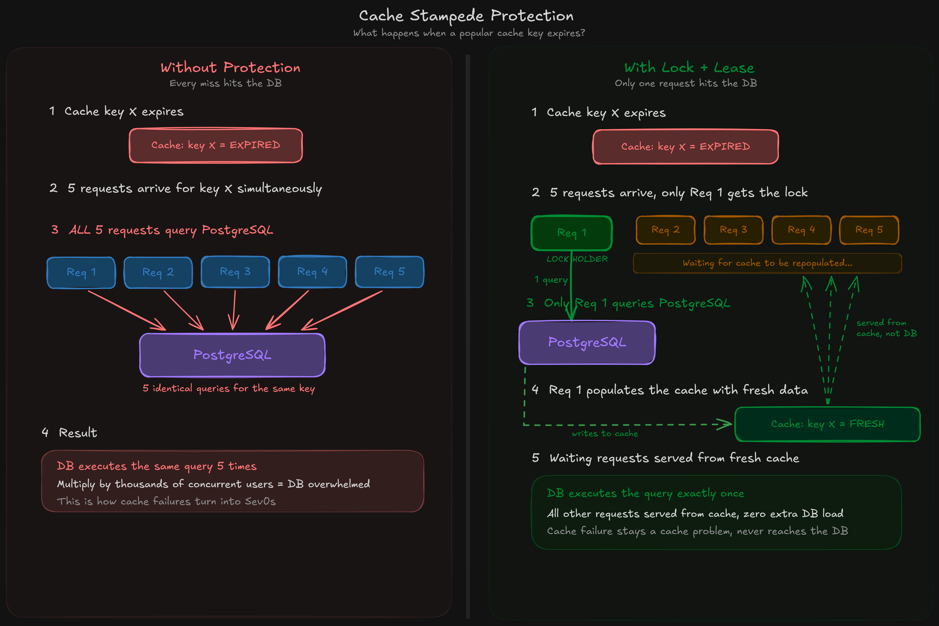 Here’s an analogy. Imagine 1,000 people all try to look up the same book in a library at the same time, and the book isn’t on the shelf. Without protection, all 1,000 people walk to the back room and ask the librarian for it simultaneously. With stampede protection, one person goes to the back room, and the other 999 wait at the shelf until the book is returned and reshelved. The librarian (PostgreSQL) only gets asked once.