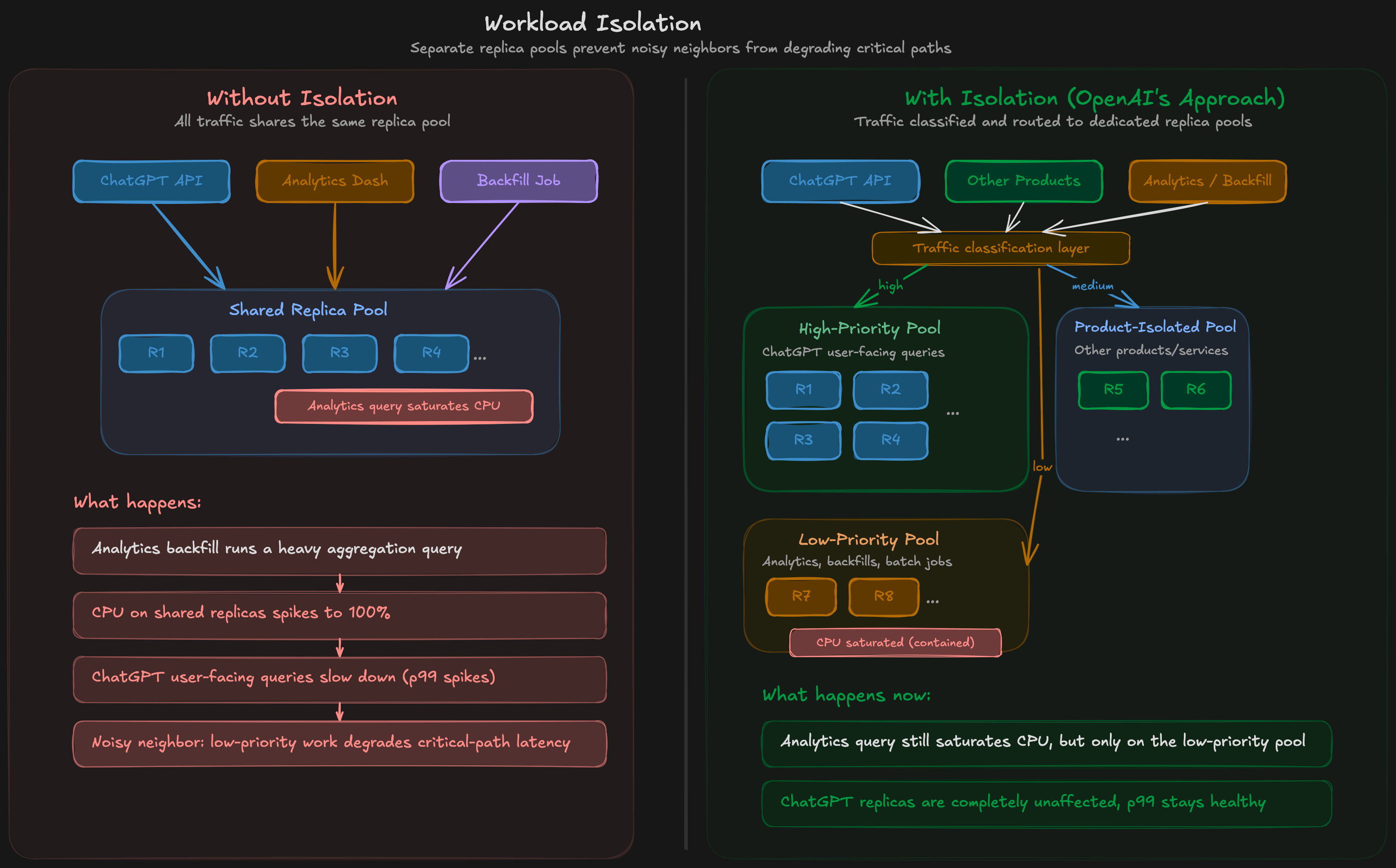 They split traffic into low-priority and high-priority tiers and route them to separate replica pools. This prevents the “noisy neighbor” problem, where an expensive analytical query or a poorly optimized new feature can saturate CPU and degrade latency for critical-path requests. They apply the same isolation across different products and services as well, so that activity from one product doesn’t affect the performance of another.