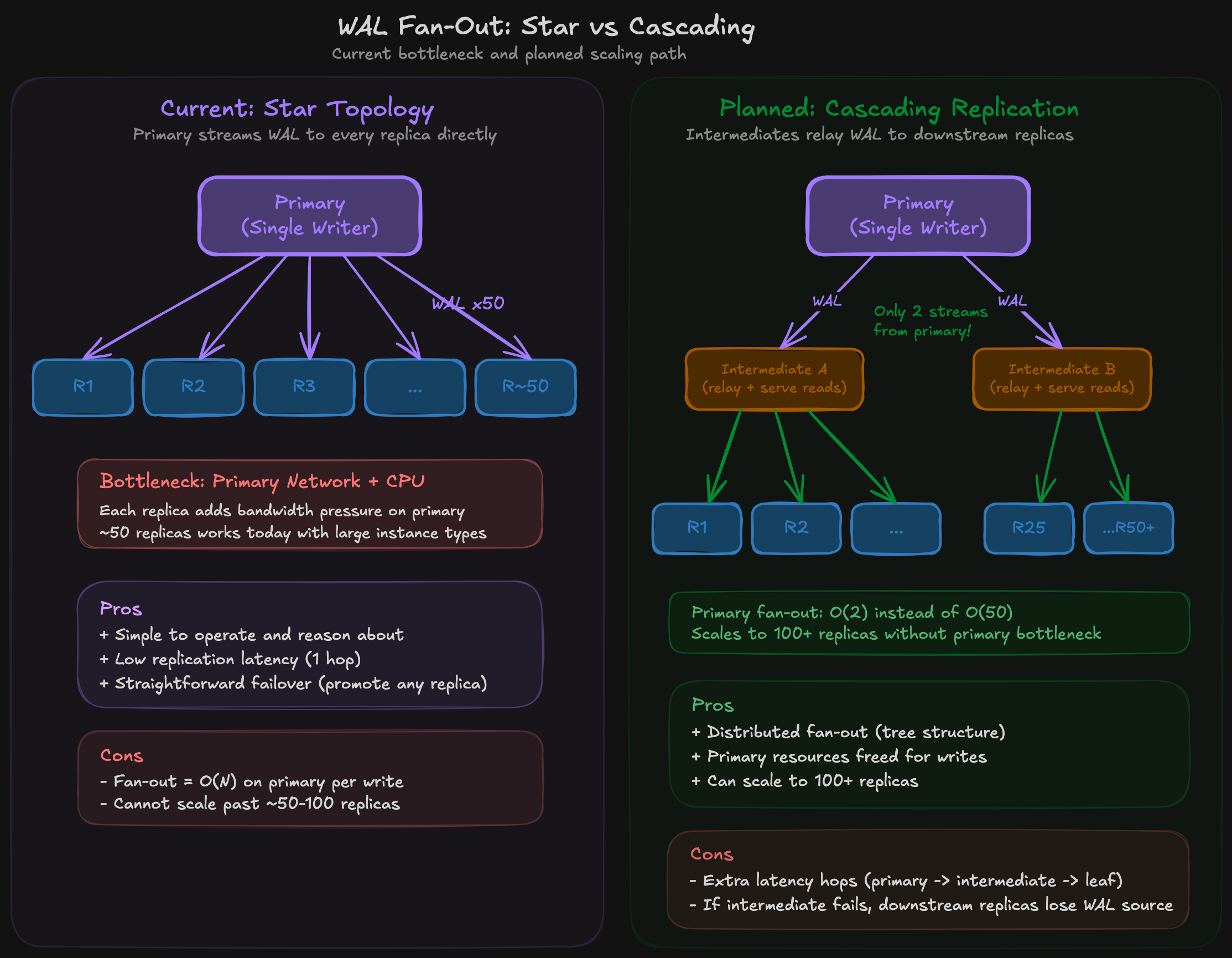 Star vs. cascading replication topologies for WAL fan-out. In the current star topology (left), the primary streams WAL directly to every replica, creating an O(N) network bottleneck. In the planned cascading topology (right), intermediate replicas relay WAL to downstream nodes, reducing the primary’s fan-out to O(2) and enabling 100+ replicas. The trade-off is added latency hops and more complex failover if an intermediate node fails.