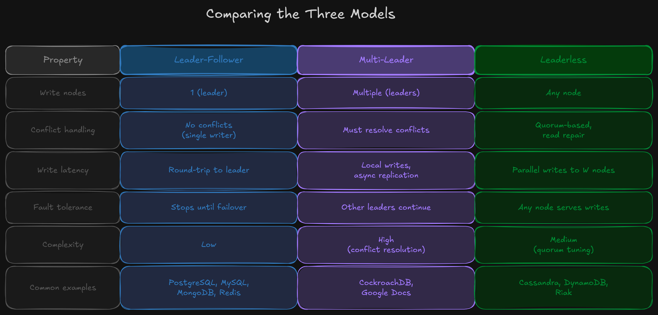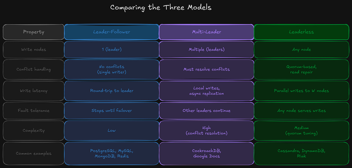 Leader-follower is the default for most applications. It’s simple, well-understood, and supported by nearly every database. Multi-leader is primarily used for multi-datacenter deployments where cross-region write latency is unacceptable. Leaderless is the choice when high write availability is the priority and the application can tolerate the complexity of quorum-based consistency.