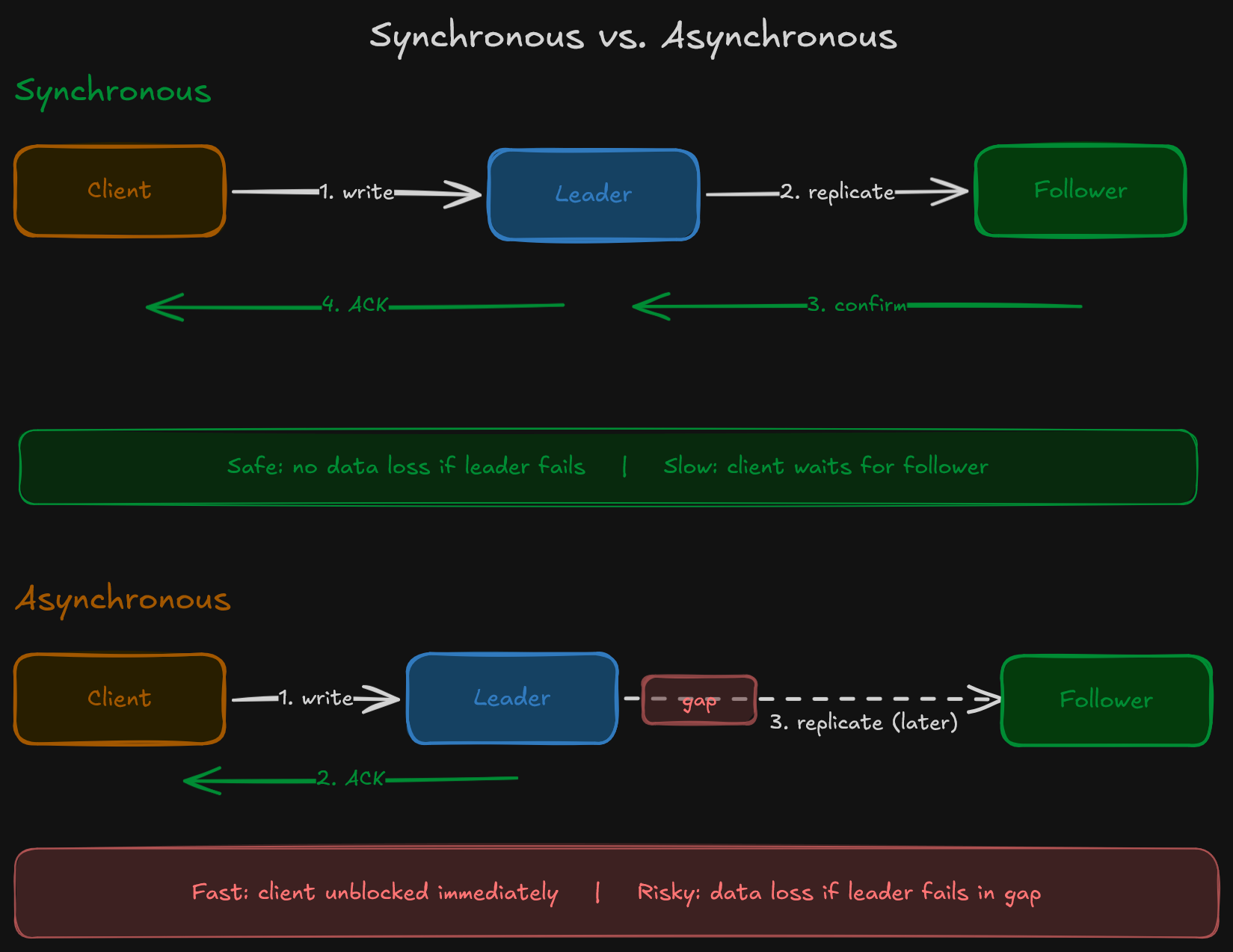 Asynchronous replication means the leader acknowledges the write immediately after writing to its own storage. Followers receive the update later. This is faster, but introduces a window where the leader has data that followers don’t yet. If the leader dies during this window, those writes are lost.