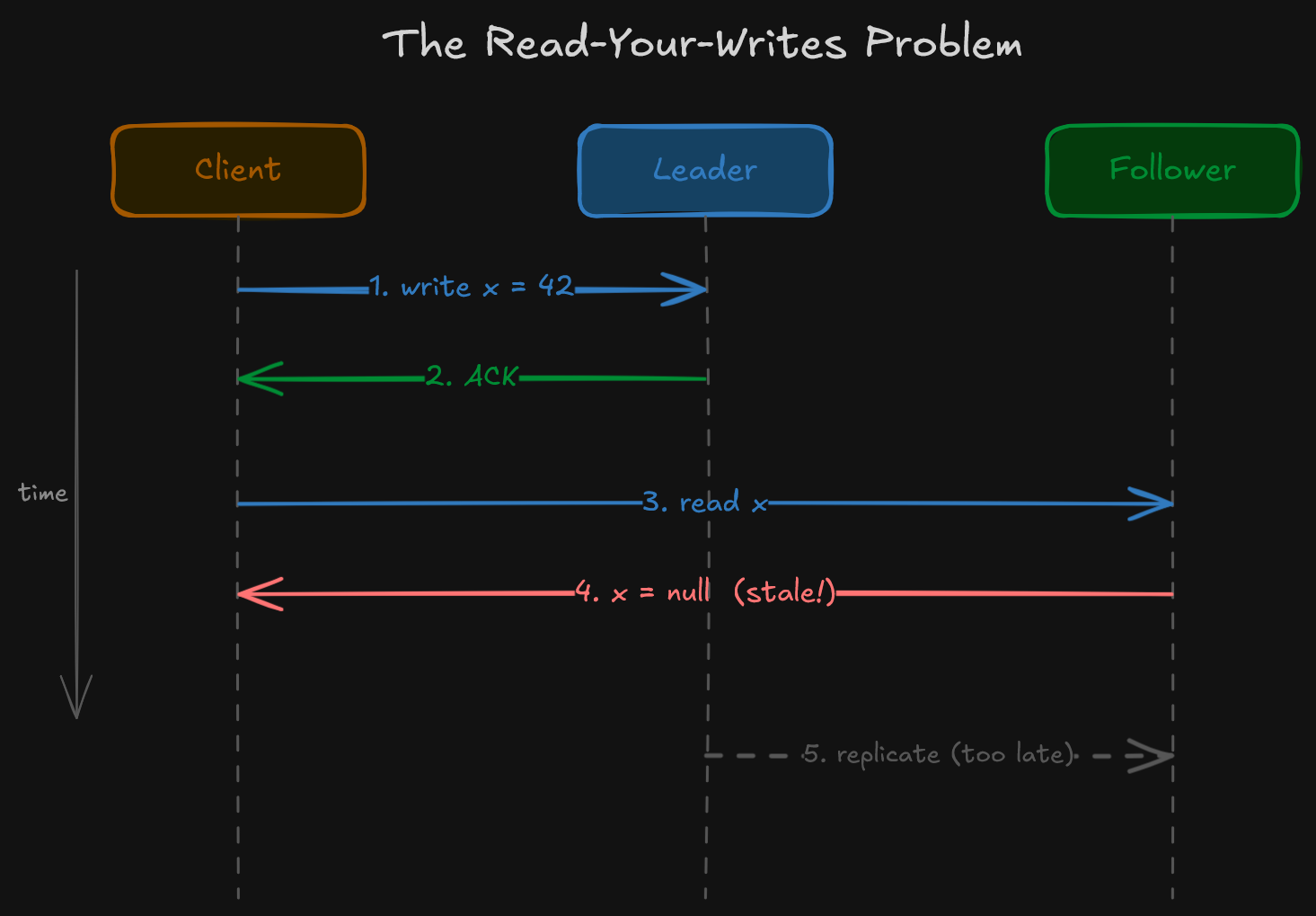 This creates a practical problem. Say a client writes to the leader and then immediately reads from a follower. The follower may not have the write yet. The client sees stale data, even though the write already succeeded. This is the “read-your-writes” consistency problem that we covered in the CAP Theorem Series Part 4 consistency spectrum.